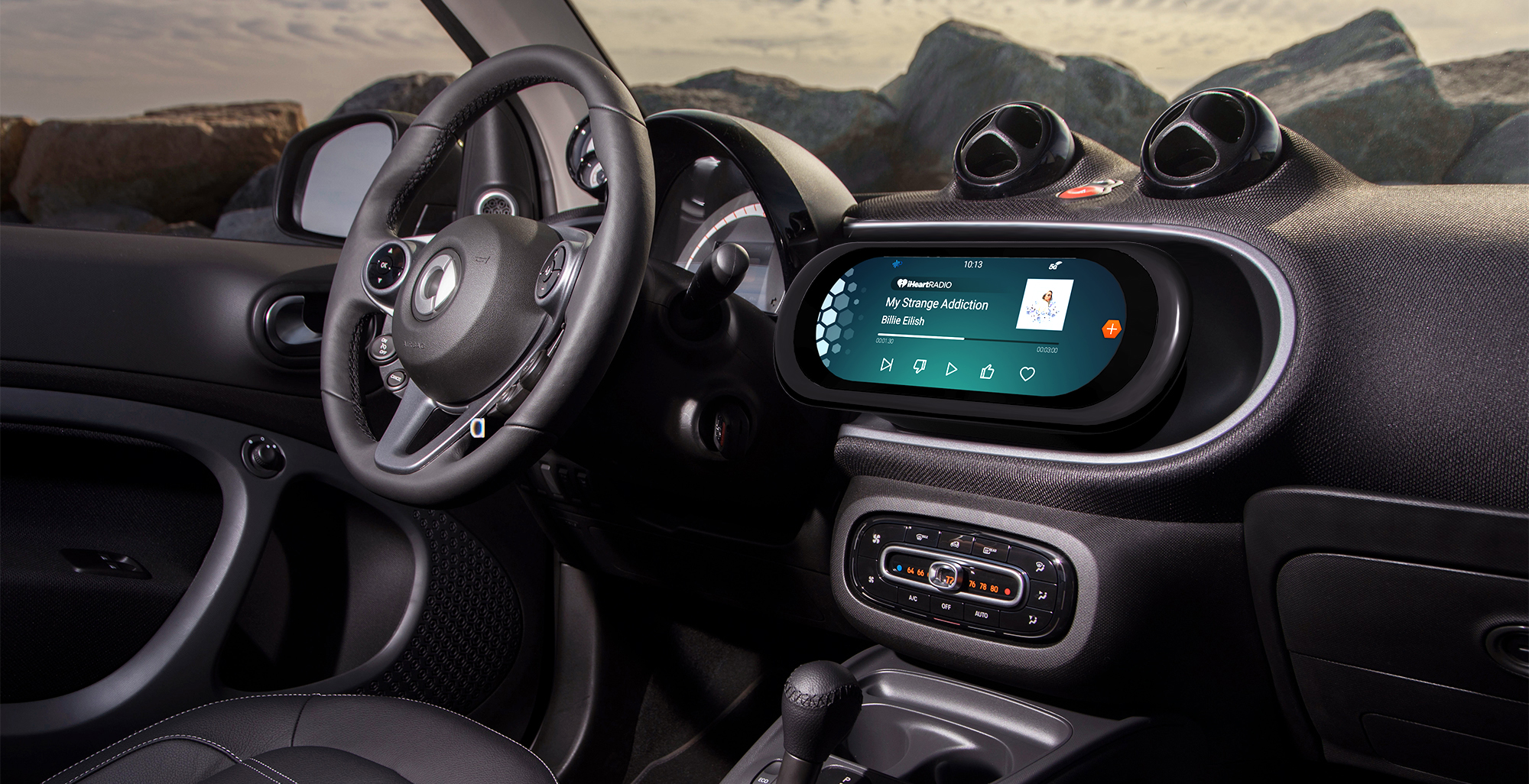 - Hexagon-inspired UI components tied to the Smart Fortwo interior